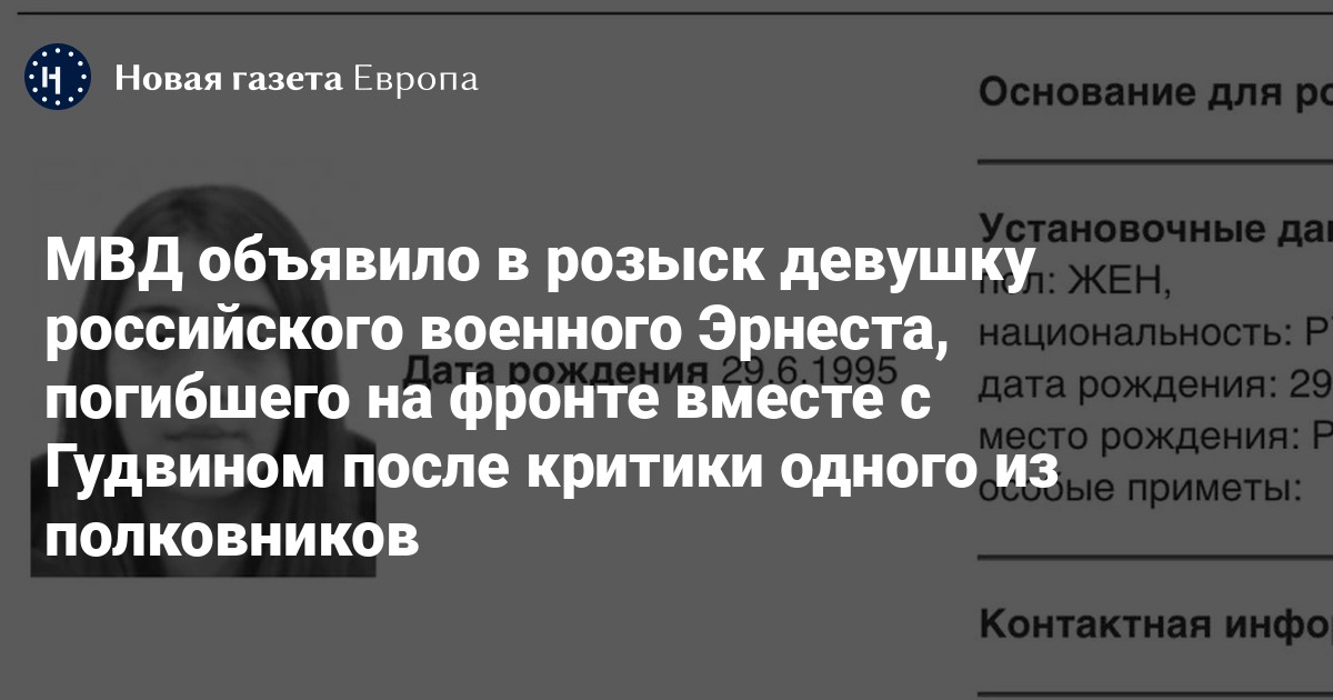 МВД объявило в розыск девушку российского военного Эрнеста, погибшего на фронте вместе с Гудвином после критики одного из полковников