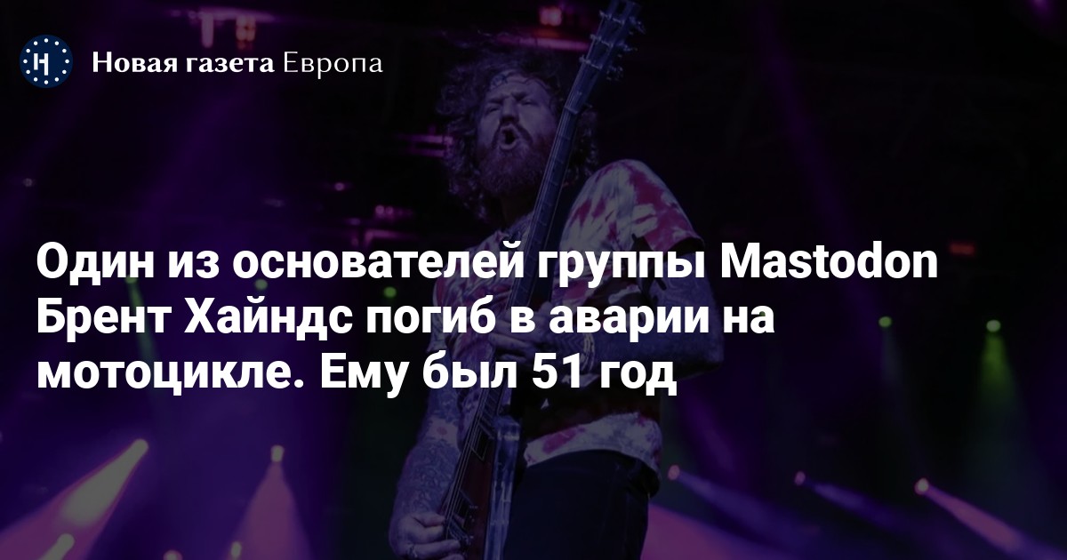 Один из основателей группы Mastodon Брент Хайндс погиб в результате дорожной аварии за рулем мотоцикла. Об этом сообщило издание Atlanta News First, позднее информацию Rolling Stone подтвердили в управлении судмедэкспертизы округа Фултон.