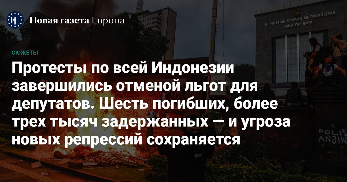 В пятницу протесты в городе Макассара, столице провинции Южный Сулавеси на востоке страны, переросли в хаос: протестующие подожгли транспортные средства и здание городского совета. В этот день погибли три человека: предположительно, жертвы оказались в ловушке в горящем здании, сообщили в Агентстве по ликвидации последствий стихийных бедствий.