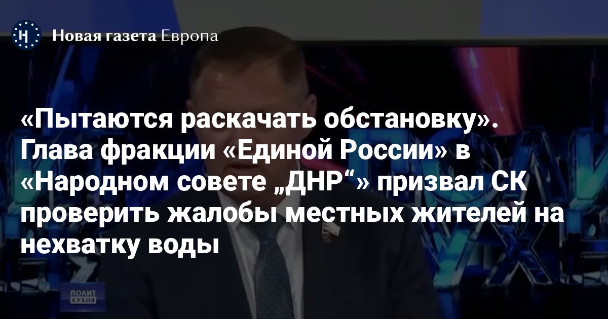 «По воде раскачивают ситуацию. Война виновата.<…> Еще раз скажу, обращение к Бастрыкину, да, от вас было. А от меня, как от руководителя фракции „Единой России“ в Народном совете, тоже обращение в СК. Я прошу вас разобраться с данным заявлением, проверить все и дать полную оценку, потому что в этом заявлении, на мой взгляд, полная ложь.