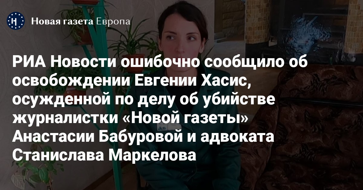 РИА Новости сообщило об освобождении Евгении Хасис — члена Боевой организации русских националистов (БОРН), осужденной по делу об убийстве журналистки «Новой газеты» Анастасии Бабуровой и адвоката Станислава Маркелова. Адвокаты женщины в разговоре с «Медиазоной» опровергли эту информацию.