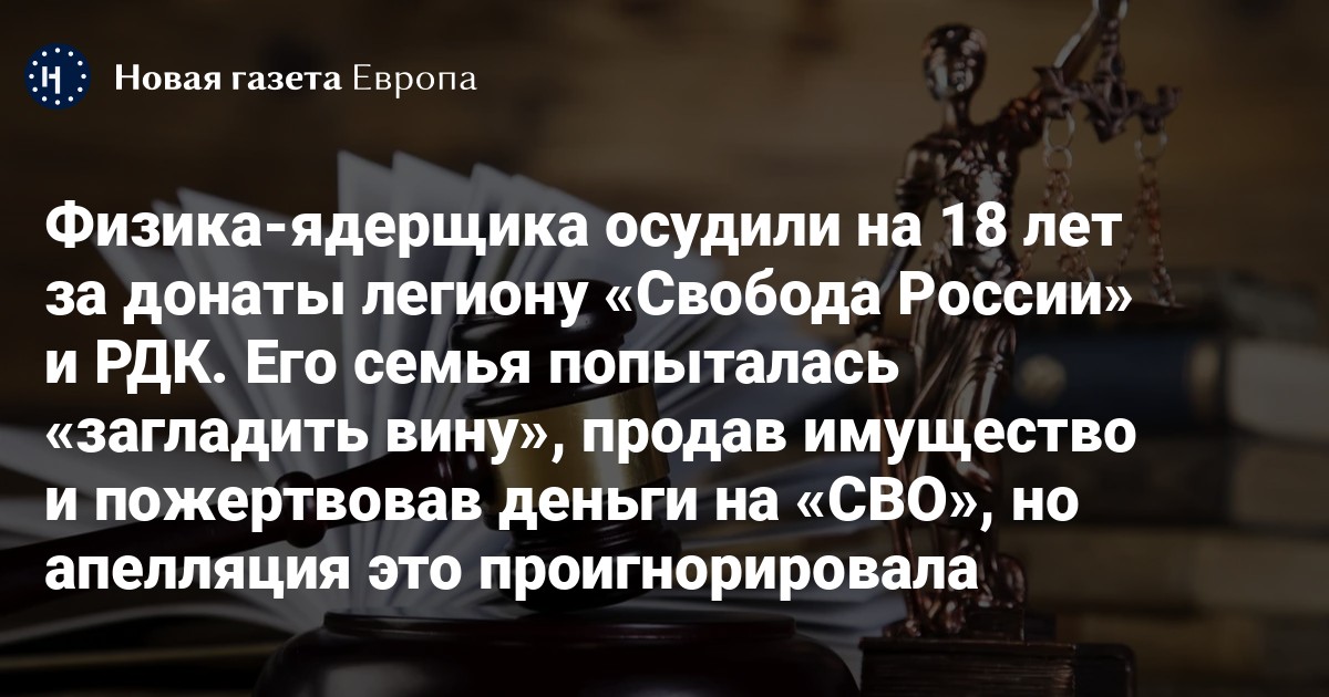 Физика-ядерщика осудили на 18 лет за донаты легиону «Свобода России» и РДК. Его семья попыталась «загладить вину», продав имущество и пожертвовав деньги на «СВО», но апелляция это проигнорировала