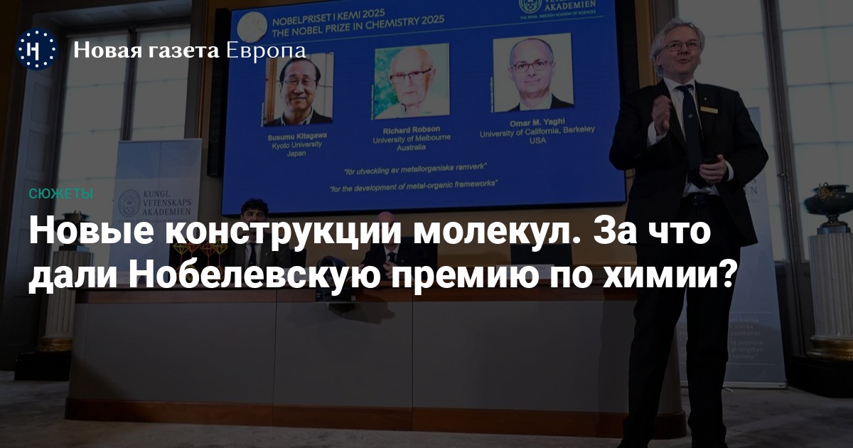 Нобелевский комитет объявил лауреатов премии по химии 2025 года. Награду получили профессор Киотского университета Сусуму Китагава, а также профессоры Мельбурнского и Калифорнийского университетов в Беркли Ричард Робсон и Омар Ягхи. Ученых отметили премией «за разработку металлоорганических каркасных структур». «Разрабатывая металлоорганические структуры, лауреаты предоставили химикам новые возможности для решения некоторых стоящих перед нами задач», — говорится в заявлении Нобелевского комитета.