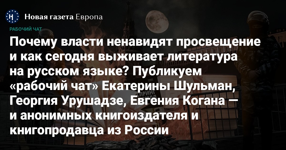 Мы задались вопросом, насколько справедлив такой оптимизм, и пригласили поговорить об этом Екатерину Шульман (председательницу жюри премии «Политпросвет»), Георгия Урушадзе (основателя Freedom Letters и премии «Книги свободы»), Евгения Когана (издателя и основателя магазина и издательства «Бабель. Тель-Авив»), а также двух коллег из России, которых мы по соображениям безопасности и по их предложению анонимно обозначим как «книготорговку» и «книгоиздателя».