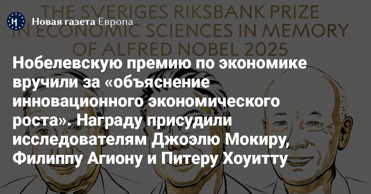 Награду поделили на две части: Мокиру вручили премию «за определение предпосылок для устойчивого роста посредством технологического прогресса», Агиону и Хоуитту — «за теорию устойчивого роста через творческое разрушение».