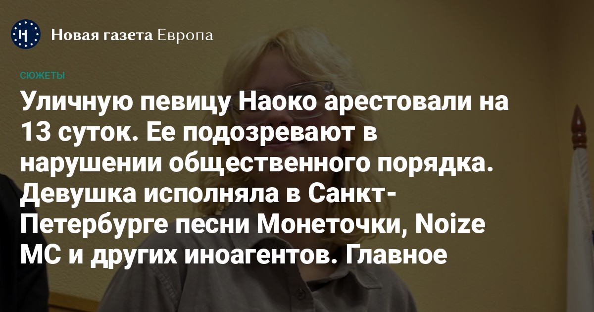 В Санкт-Петербурге арестовали на 13 суток уличную артистку Наоко, которая вместе с группой «Стоптайм» исполняла песни Земфиры, «Порнофильмов», Монеточки и других артистов. Ранее их выступлением возмутилась главная редакторка агентства «Регнум» Марина Ахмедова. СМИ сообщали, что девушку подозревают в дискредитации армии и нарушении общественного порядка. При этом «Бумага» уточняет, что в суде ей вменили только статью 20.2.2 КоАП.