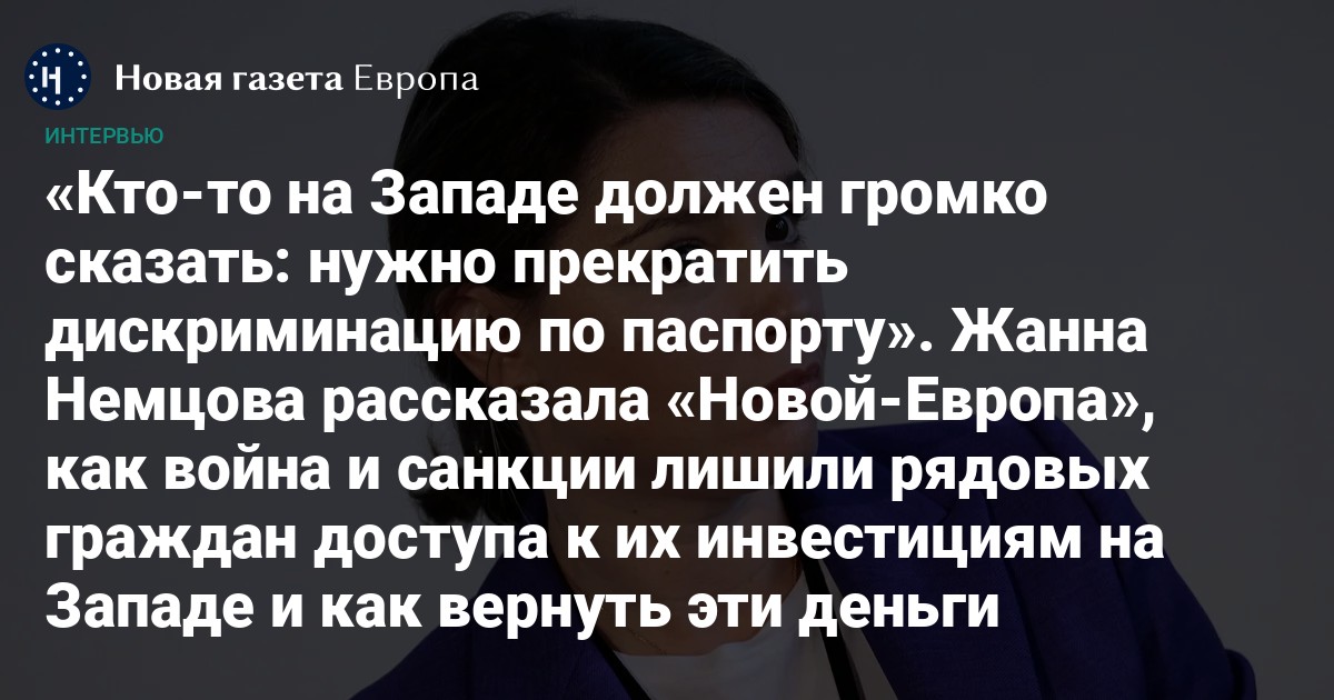 Проект Ideas for Russia «Фонда Бориса Немцова за Свободу» и исследовательский центр Social Foresight Group провели подробное исследование этой проблемы и описали тех, кто пострадал от этих санкций. Руководитель проекта Жанна Немцова рассказала экономическому обозревателю «Новой-Европа» Денису Морохину о том, какие есть способы вернуть россиянам их сбережения и почему нельзя массово наказывать людей, чья вина не доказана, только по одному признаку их гражданства.