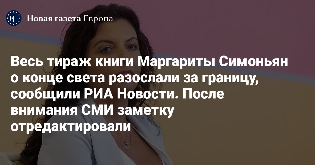 РИА Новости сообщили, что весь тираж книги пропагандистки Маргариты Симоньян «В начале было Слово — в конце будет Цифра» отправили за границу. Внимание на это обратили Олег Кашин и Илья Шепелин.