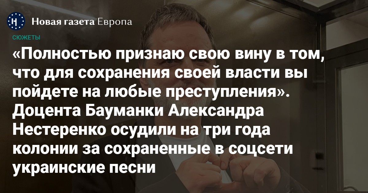Напомним, 62-летний преподаватель, доцент Московского государственного технического университета имени Баумана, кандидат философских наук Александр Нестеренко обвинялся в «возбуждении ненависти либо вражды» и «призывах к экстремизму» за сохраненные когда-то на его открытой странице во «ВКонтакте» песни «Ми ростем» и «Батько наш Бандера, Україна — мати» украинской рок-группы «Воплі Відоплясова» («Вопли Видоплясова»), а также песню «Зродились ми великої години» (Марш украинских националистов) и другие в формате аудио и видео.