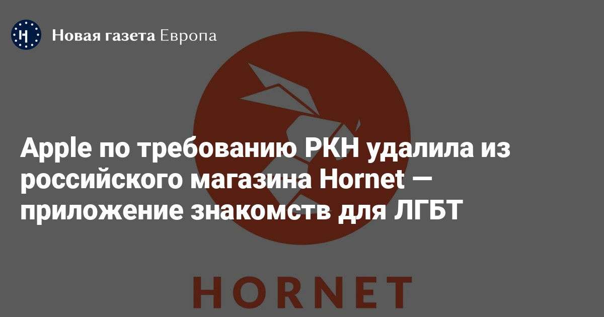 Apple удалила из российского AppStore приложение для ЛГБТ-знакомств Hornet. Об этом сообщает издание Парни+ со ссылкой на пресс-службу Hornet.