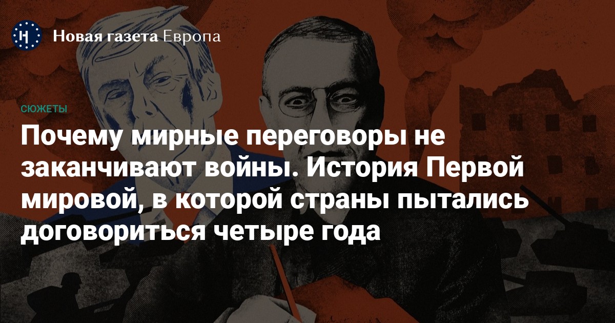Всё это время продолжались обстрелы и наступления, и ни один из планов не привел ни к прекращению огня, ни к мирному договору. Многочисленные «мирные инициативы», которые не останавливают боевые действия, напоминают ситуацию столетней давности во время Первой мировой — важнейшей войны XX века, заложившей почву для многих конфликтов, которые тянутся по сей день. История Первой мировой более запутанная и неоднозначная, чем история Второй мировой, где есть бесспорное зло в лице нацистской Германии. Разобраться в этом конфликте полезно, чтобы увидеть, как войны начинаются из-за непримиримых противоречий, почему такие конфликты очень сложно закончить, и какую роль в окончании боевых действий играют мирные инициативы политиков.