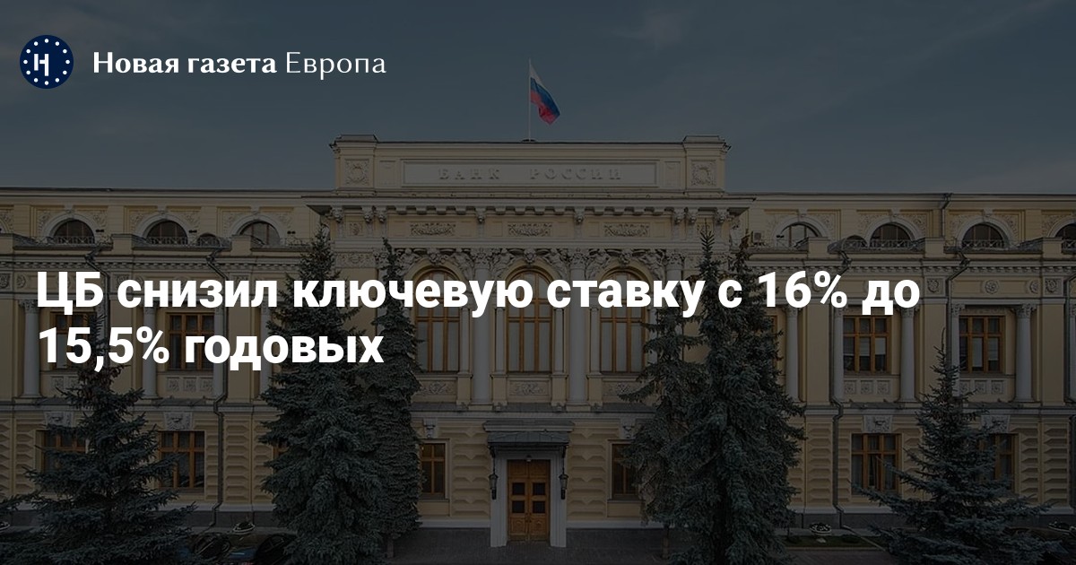 Центробанк снизил ключевую ставку с 16% до 15,5% годовых.