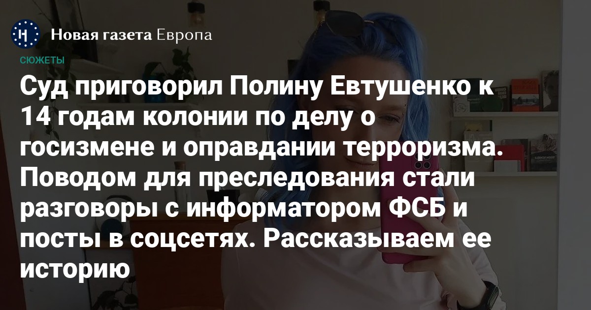 Центральный окружной военный суд Самары Суд приговорил Полину Евтушенко к 14 годам колонии общего режима. Ее признали виновной в приготовлению к госизмене, содействию терроризму и его публичном оправдании, призывах к осуществлению экстремистской деятельности, «фейках об армии» и «реабилитации нацизма». Также следствие считает, что Евтушенко «склоняла жителя Самары к совершению государственной измены» — к вступлению в легион «Свобода России».