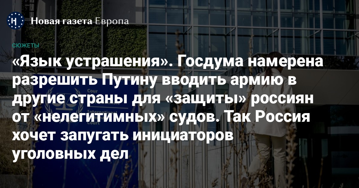 Правительство внесло в Госдуму законопроект, расширяющий основания для использования армии за рубежом. Согласно ему, президент сможет привлекать армию для «защиты» россиян, если их арестовывают или судят за рубежом по решению судов, которые Москва считает нелегитимными. В частности, речь идет об ордерах Международного уголовного суда и возможных трибуналах по военным преступлениям в Украине.